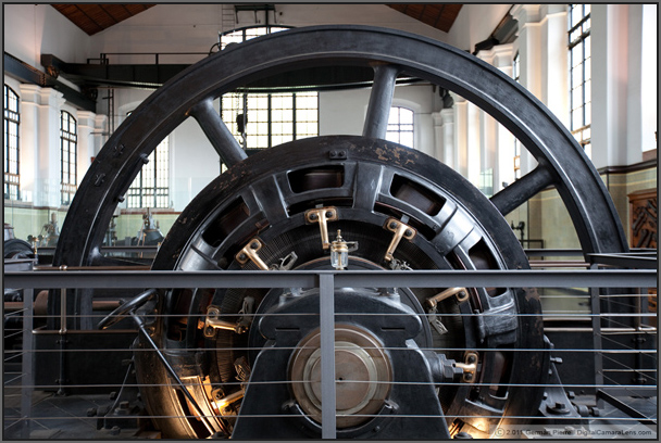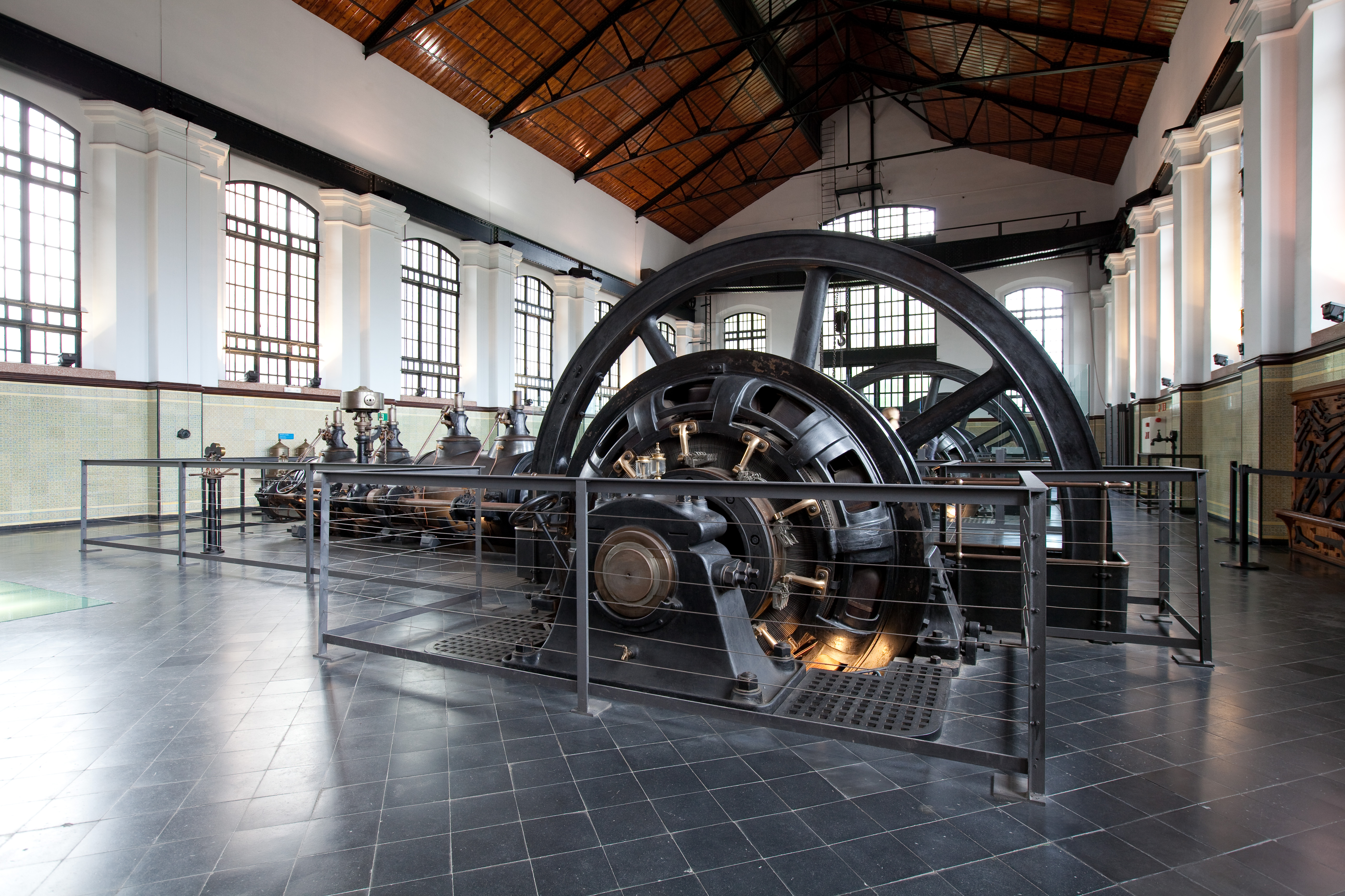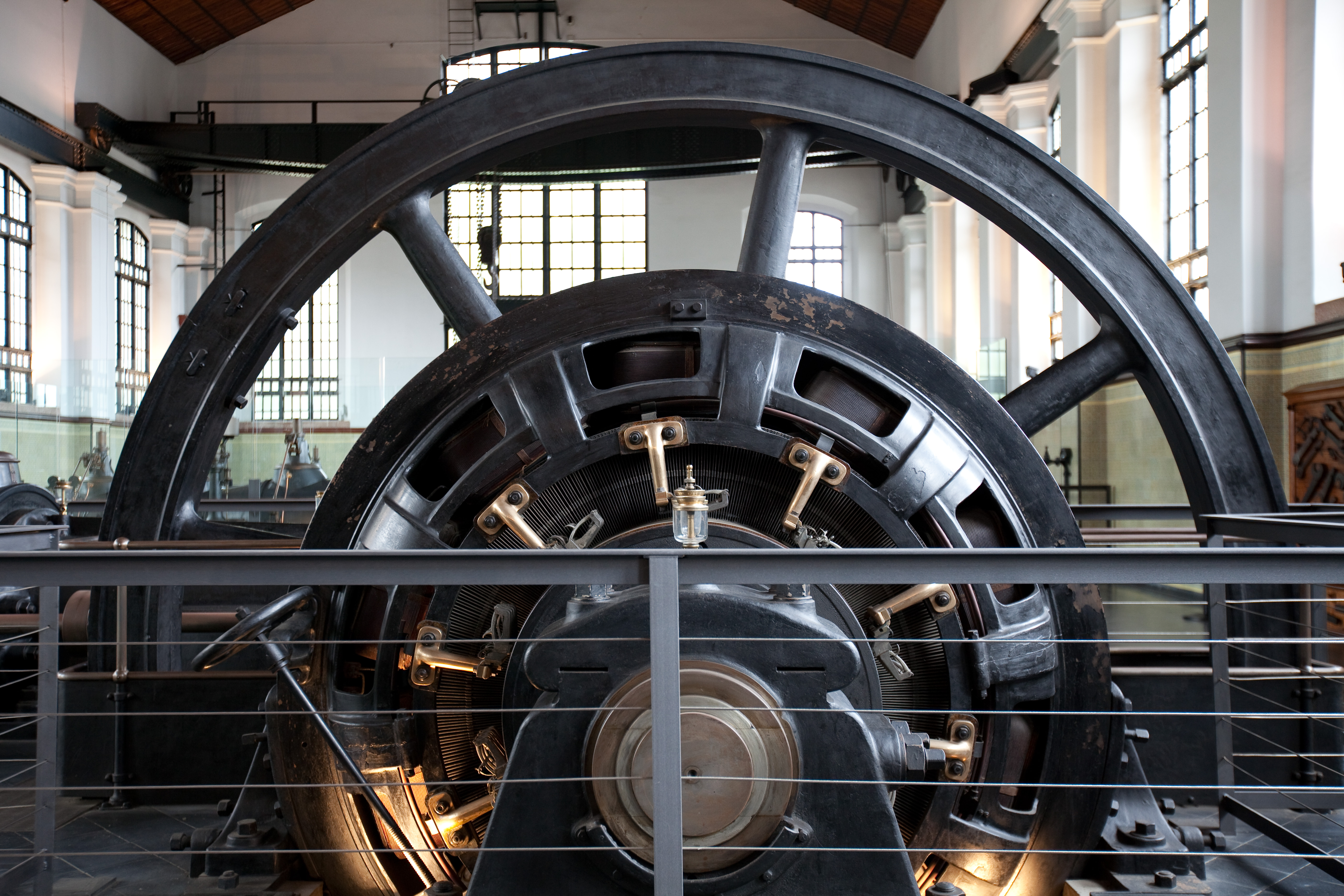Ocupando toda la planta podemos ver cuatro enormes dinamos con un volante de