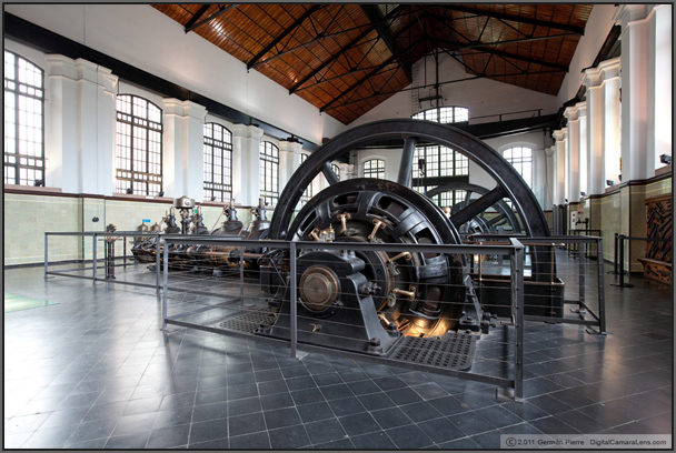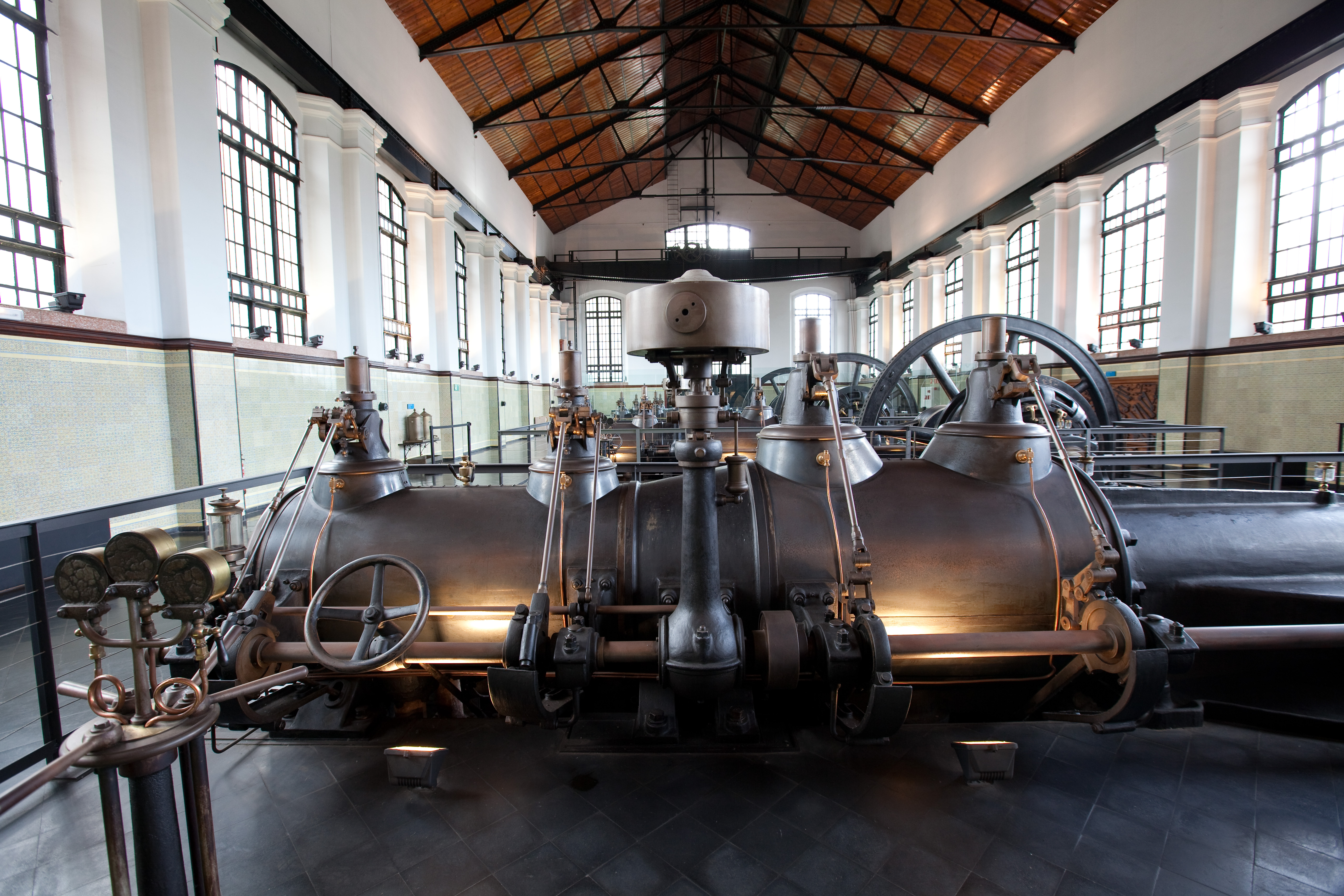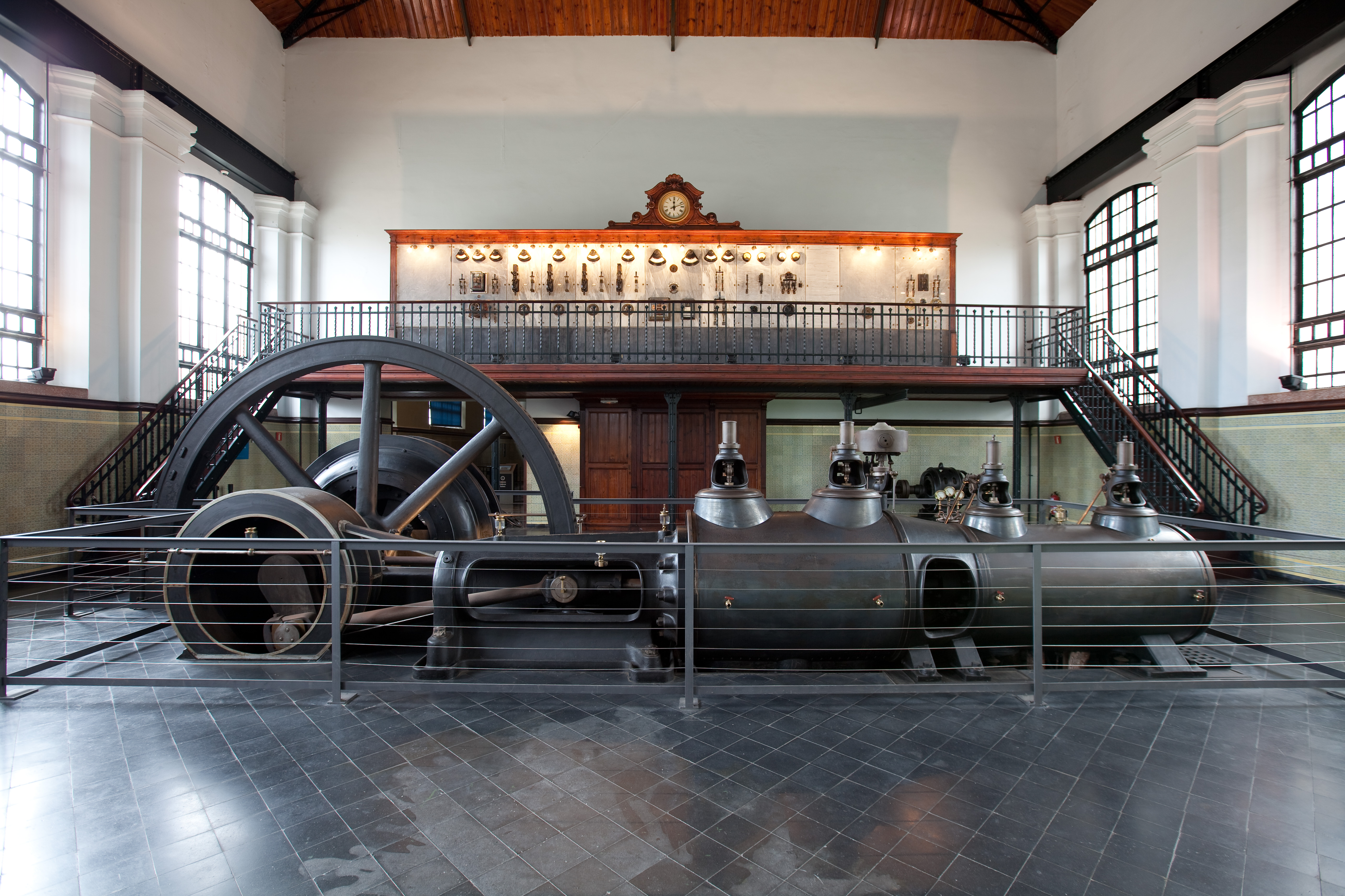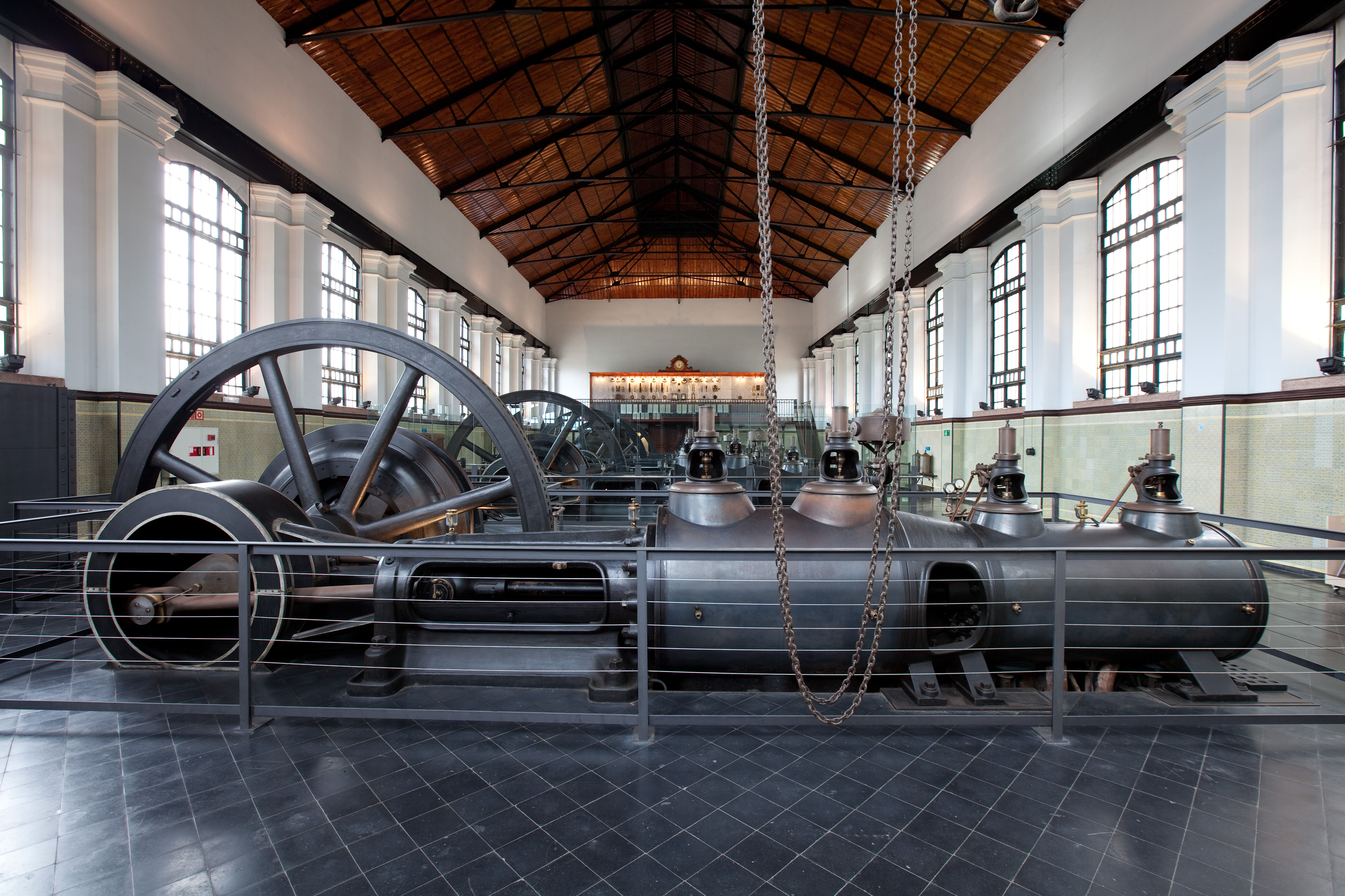 Ocupando toda la planta podemos ver cuatro enormes dinamos con un volante de