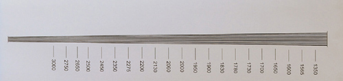 una carta con tres grupos formados por 9 líneas negras y 8 blancas con el mismo ángulo de incidencia,