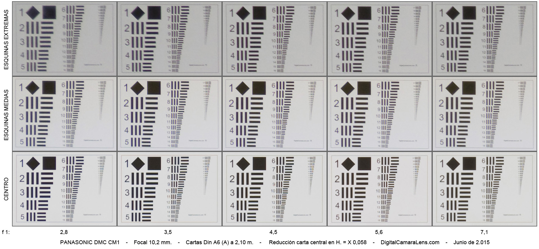 zonas centro/esquina media/esquina extrema de 28 mm. a f 1:4,5 |