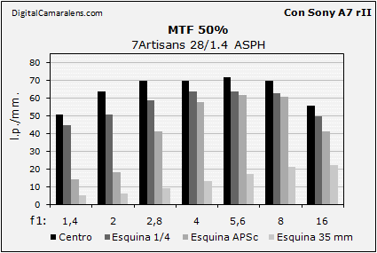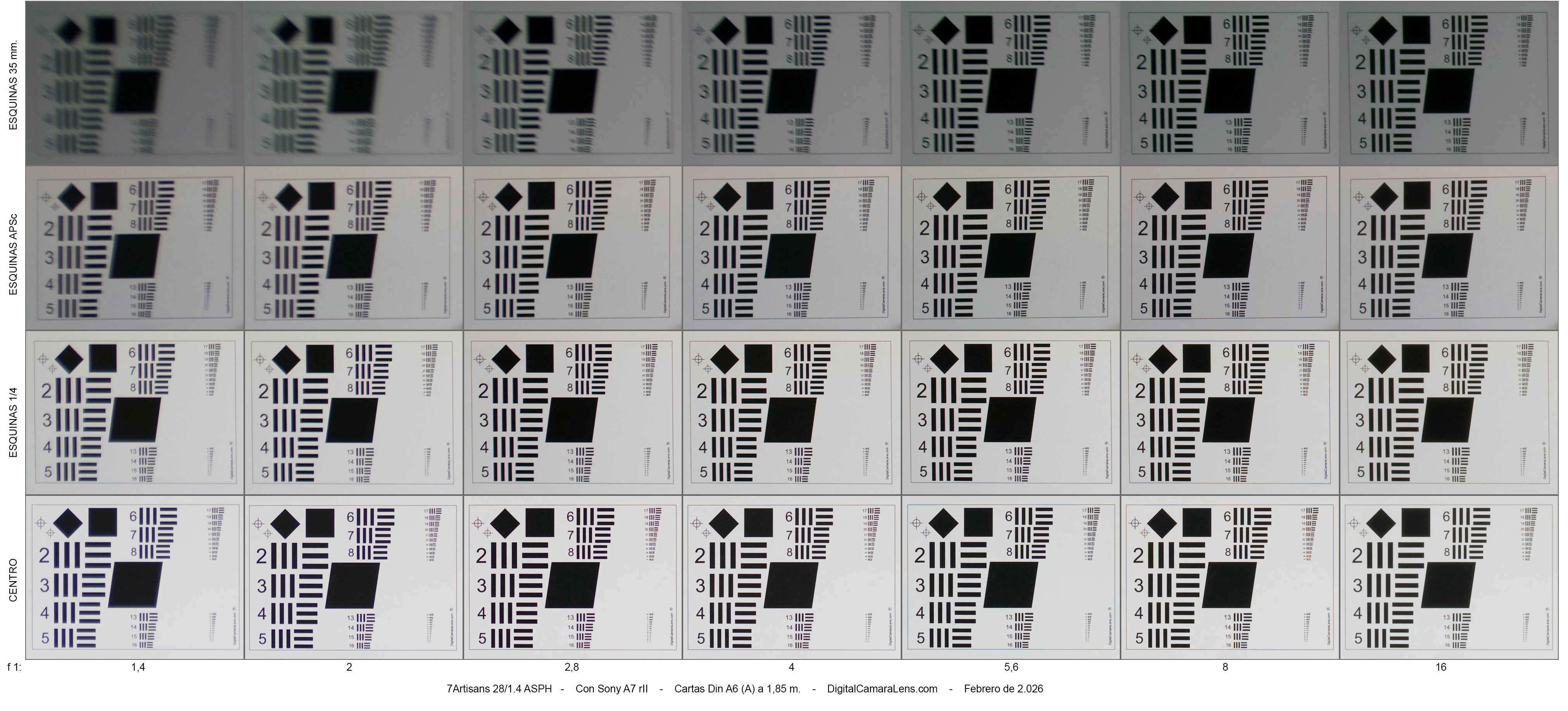 - Nitidez central excelente así como la esquina 1/4. Las otras dos son