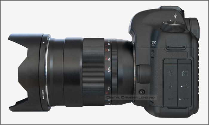 A continuación unas imágenes del objetivo en oblicuo, con parasol y montado en la cámara donde