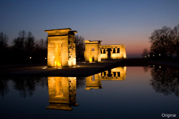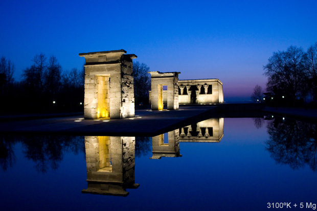 imagen un templo, iluminado por una mezcla de focos halógenos y tungsteno,