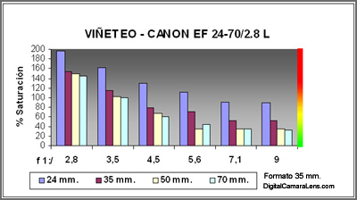 Viñeteo importante en los dos primeros diafragmas en formato de 35 mm. y en