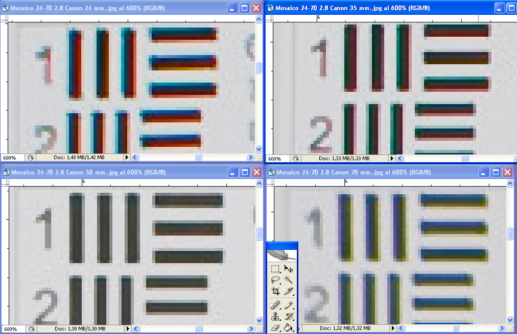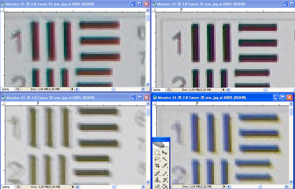 amplificadas al 600%, veréis las esquinas extremas de las cuatro focales