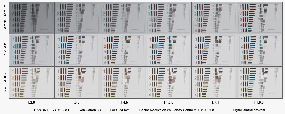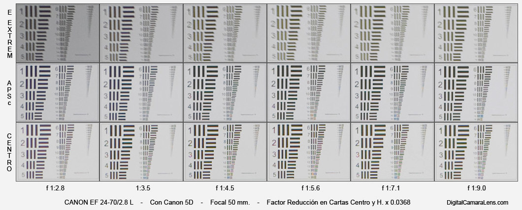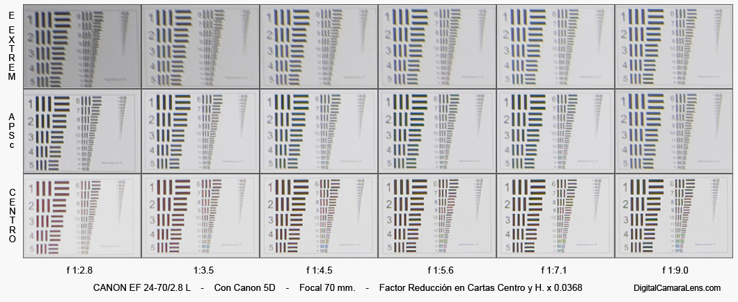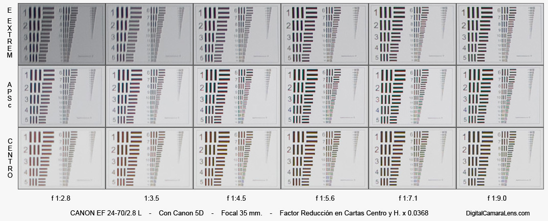 central, la esquina extrema APSc y la esquina extrema de 35 mm.