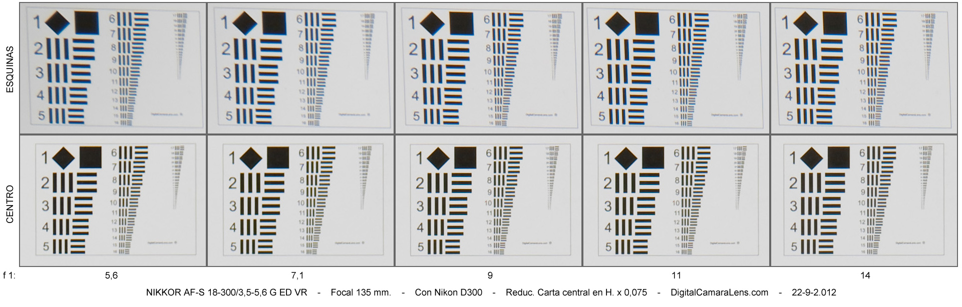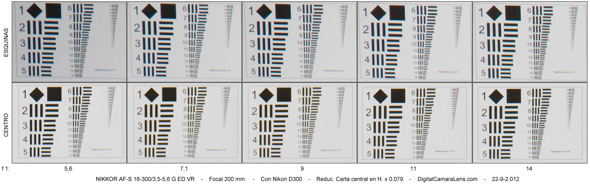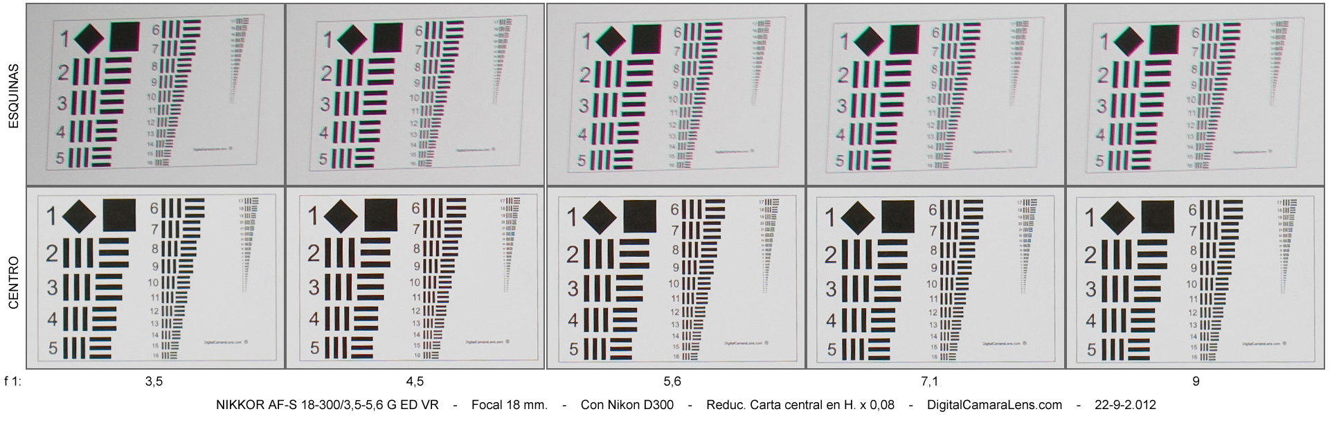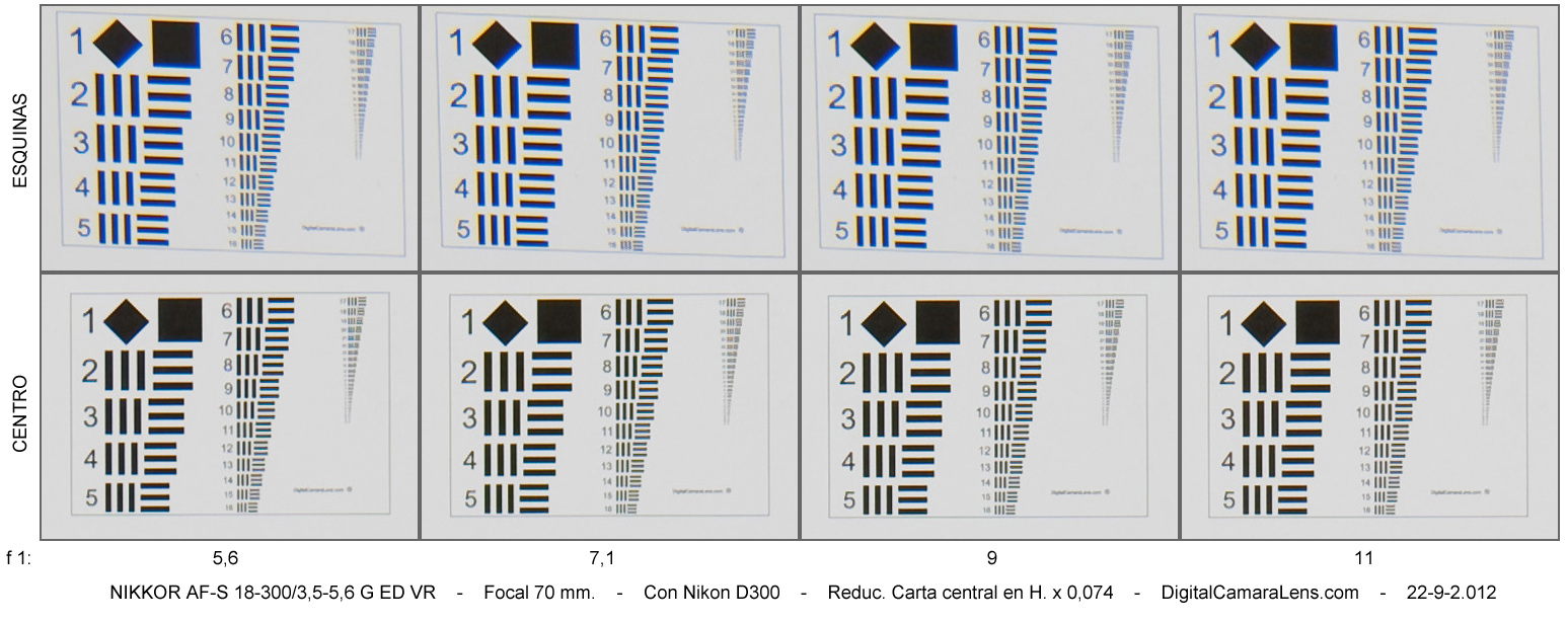 de nitidez [centro | esquinas] por focal y abertura.