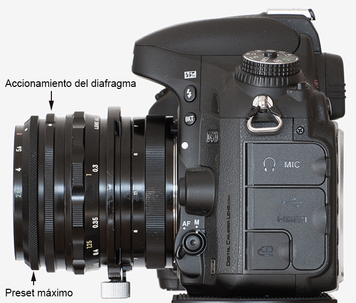 - el anillo de "Accionamiento del diafragma" lo abre y lo cierra de