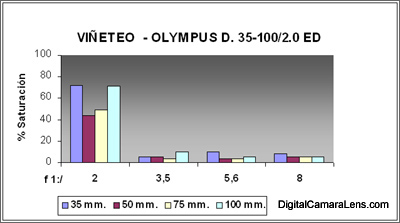 El viñeteo, salvo a plena abertura en cada focal, (el cual se muestra