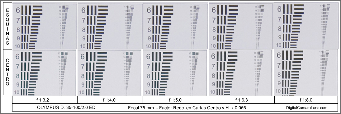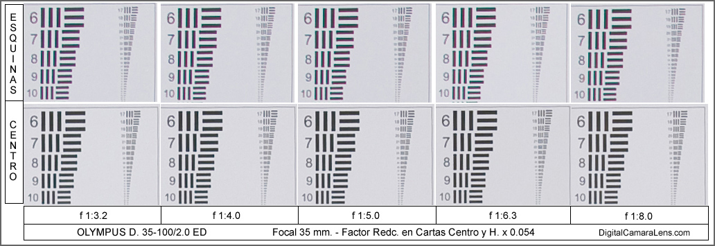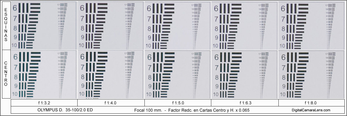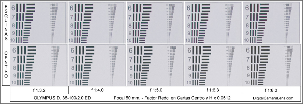 f 1:4.0 y f 1:5.0 y la zona de mejor contraste centro/esquina entre f 1:6.3