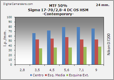 de nitidez [centro | esquinas] por focal y abertura.