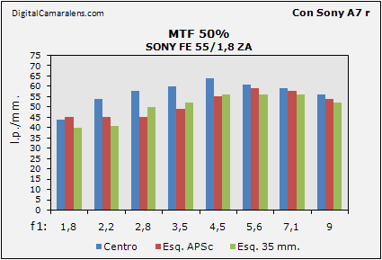 unas esquinas con unos valores MTF elevados donde las de la zona de 35 mm.